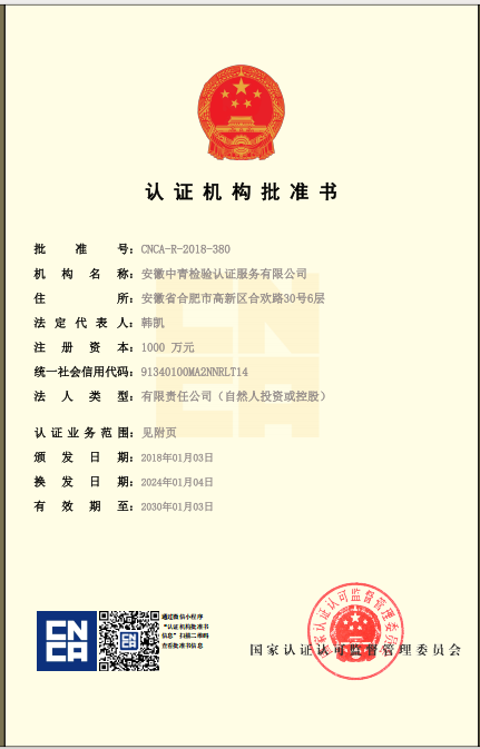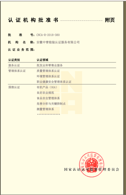 安徽中青檢驗(yàn)認(rèn)證服務(wù)有限公司成立于2017年6月6日,2018年1月3日通過國家認(rèn)證認(rèn)可監(jiān)督管理委員會(huì)批準(zhǔn),現(xiàn)認(rèn)證領(lǐng)域:質(zhì)量管理體系、環(huán)境管理體系、職業(yè)健康安全管理體系、食品安全管理體系、HACCP管理體系、有機(jī)產(chǎn)品認(rèn)證、良好農(nóng)業(yè)規(guī)范、服務(wù)體系、醫(yī)療器械質(zhì)量管理體系、企業(yè)誠信管理體系、食品工業(yè)企業(yè)誠信管理體系、食安安徽品牌等類別認(rèn)證。
